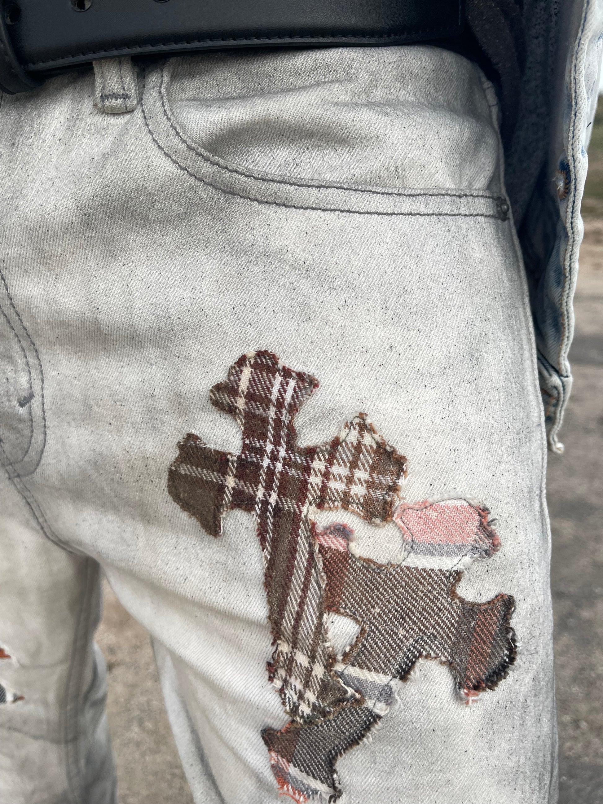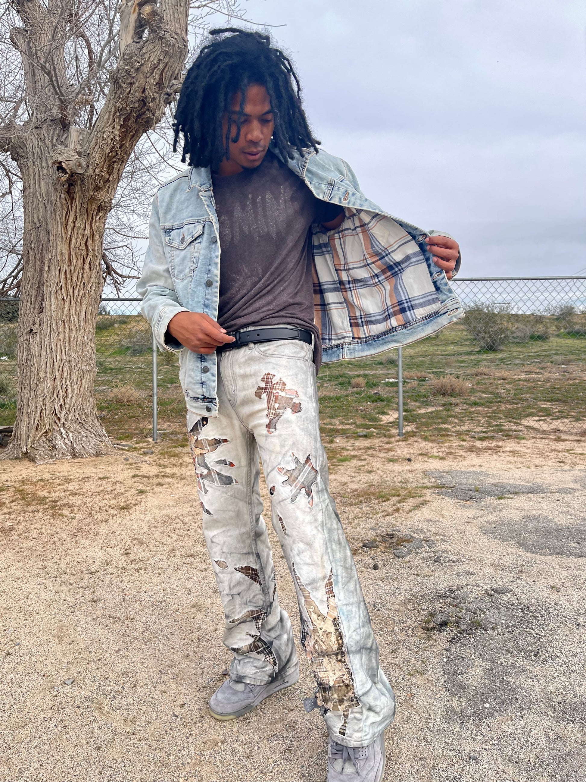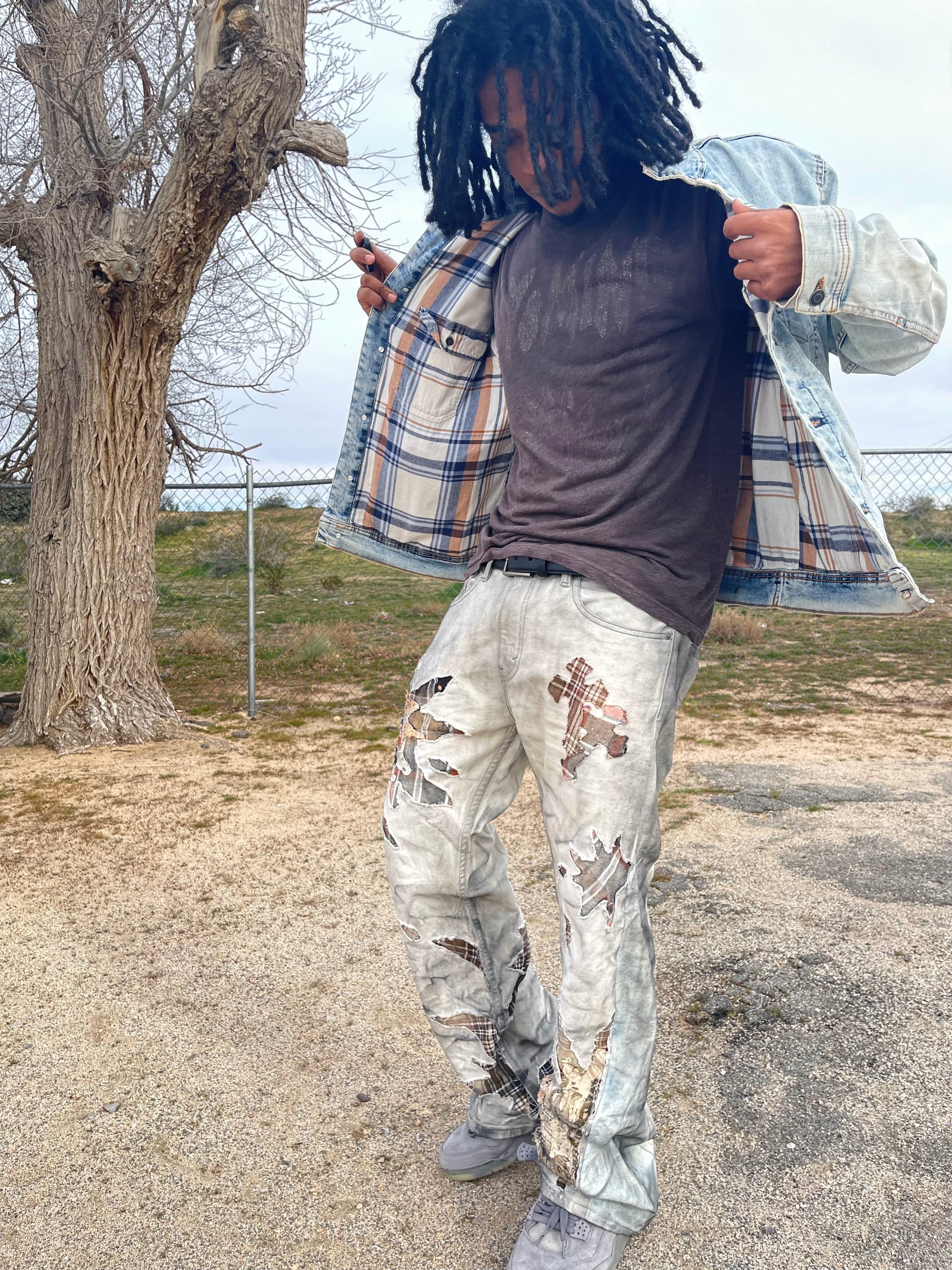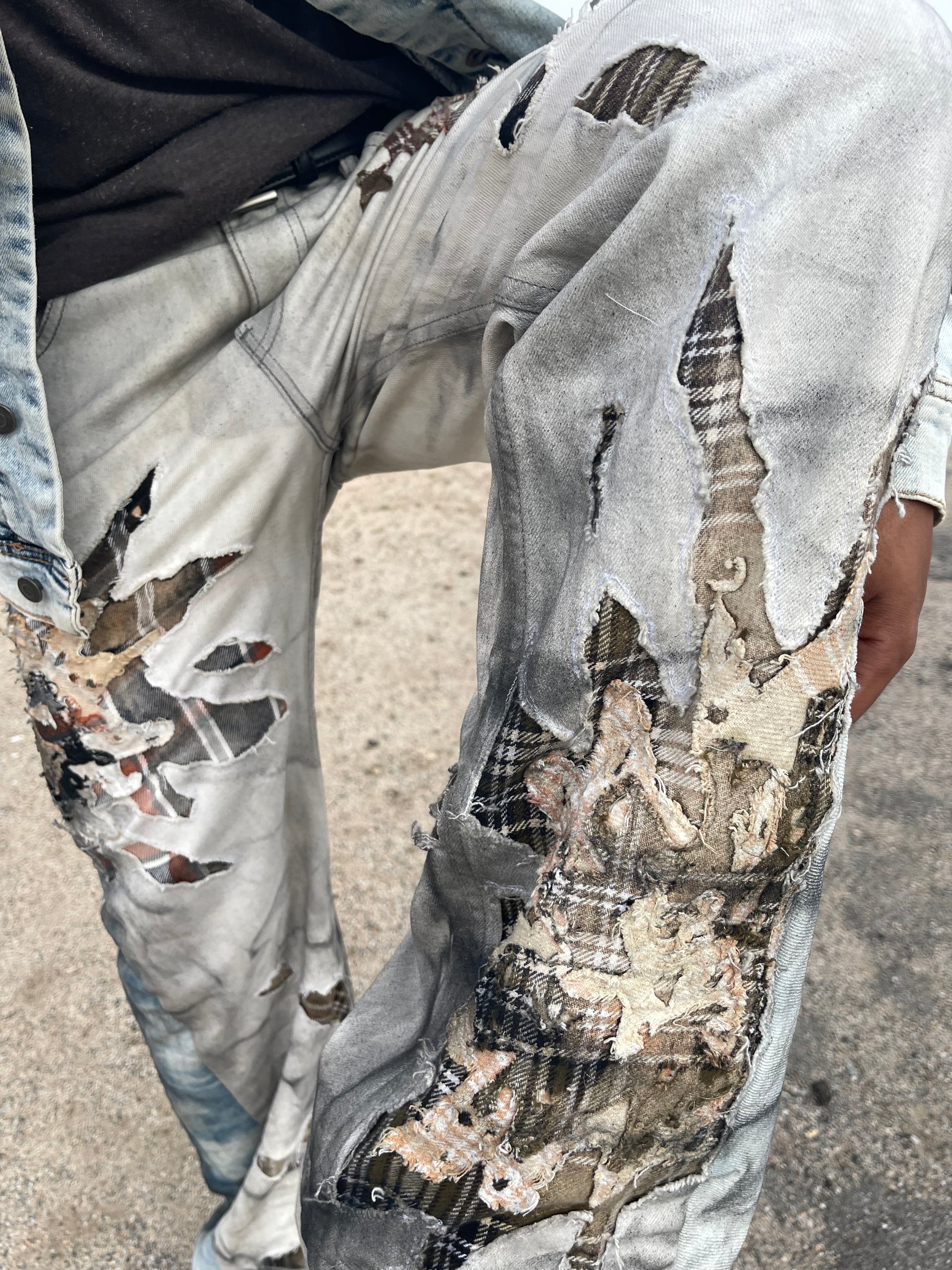Tore up these Levi’s and stitched in some bleached plaids underneath and tore those up too. Finished the piece with black paint to get this flow pattern. Real rockstar jeans. 💎