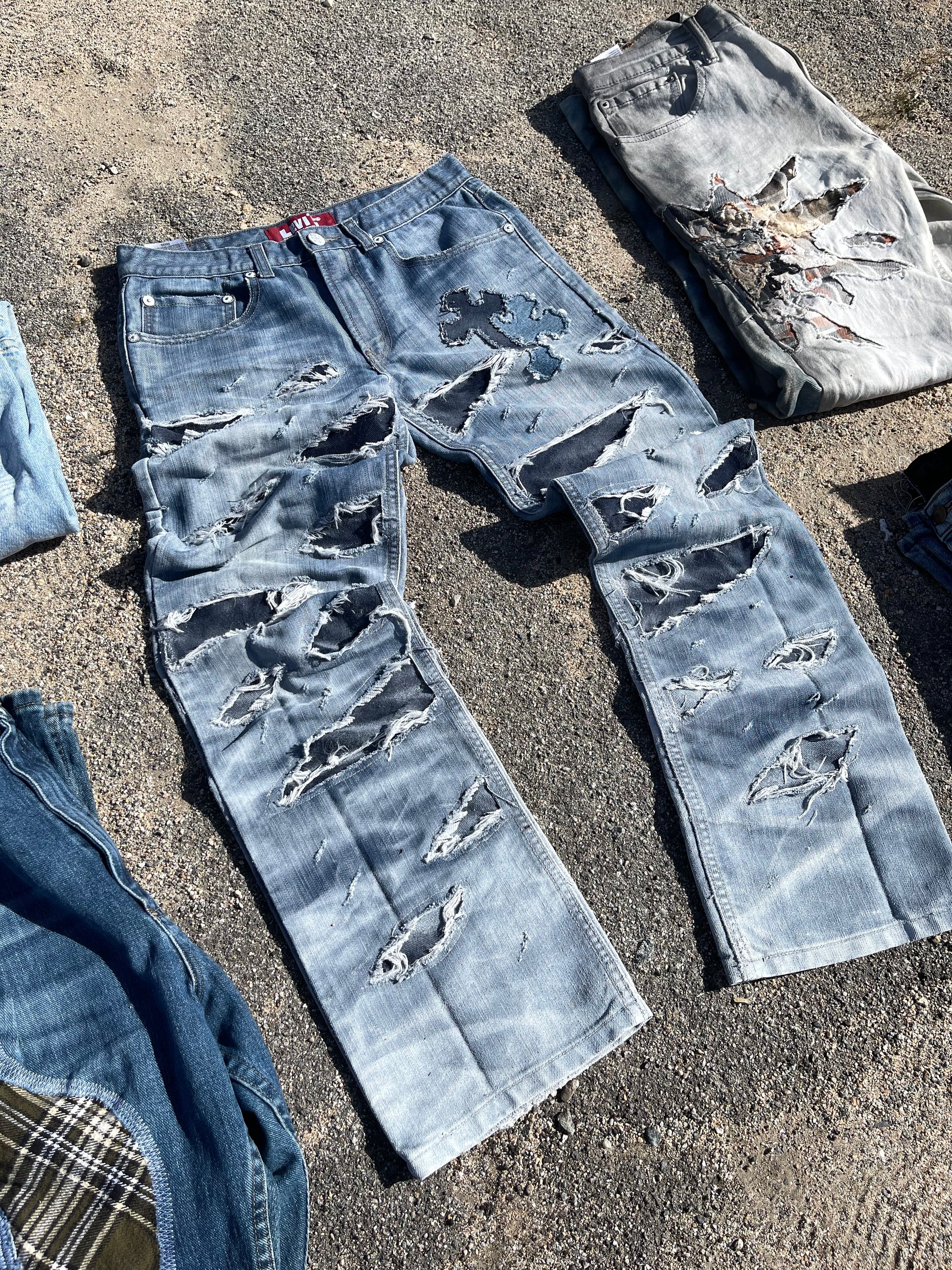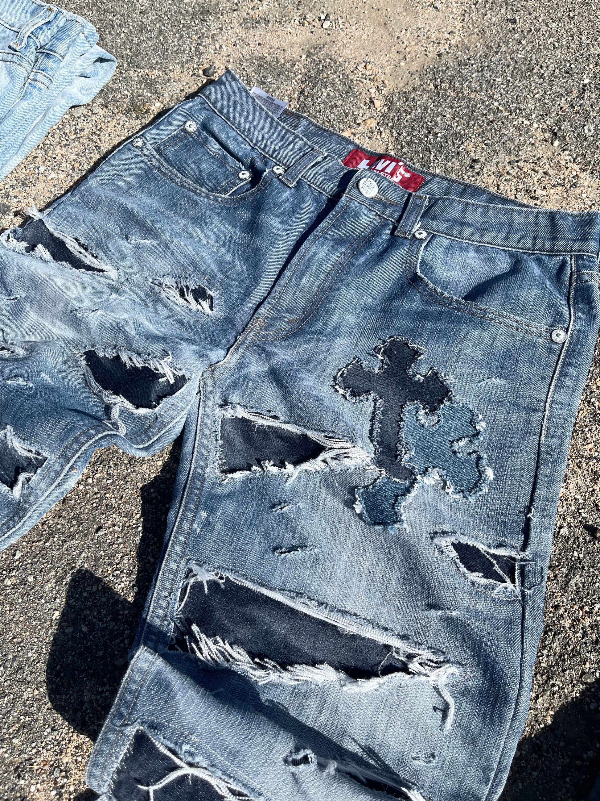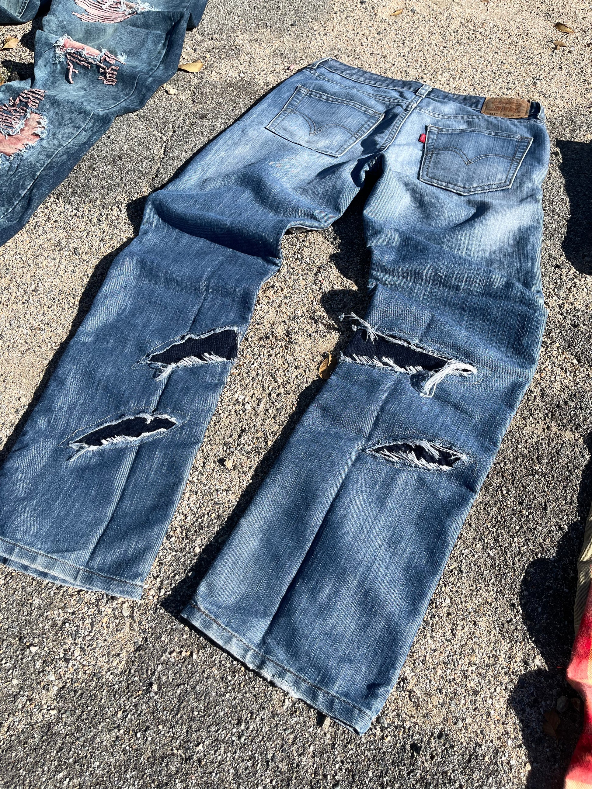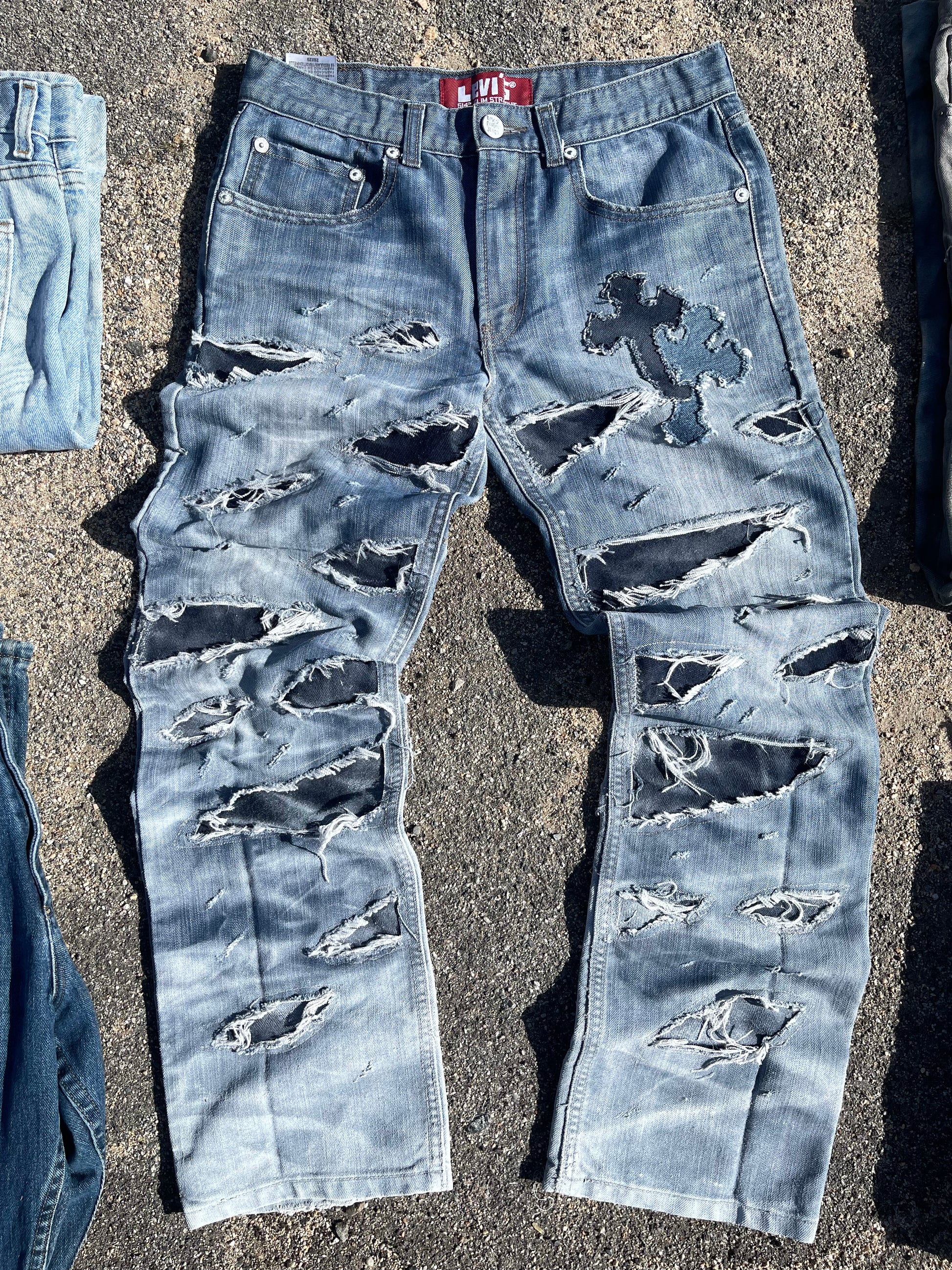 Reworked Levi’s 514. Opened these denims up with some big rips on both legs, stitched some different color denim fabric underneath to get that contrast. And our signs double cross to complete the look. A clean standout piece. 🔥