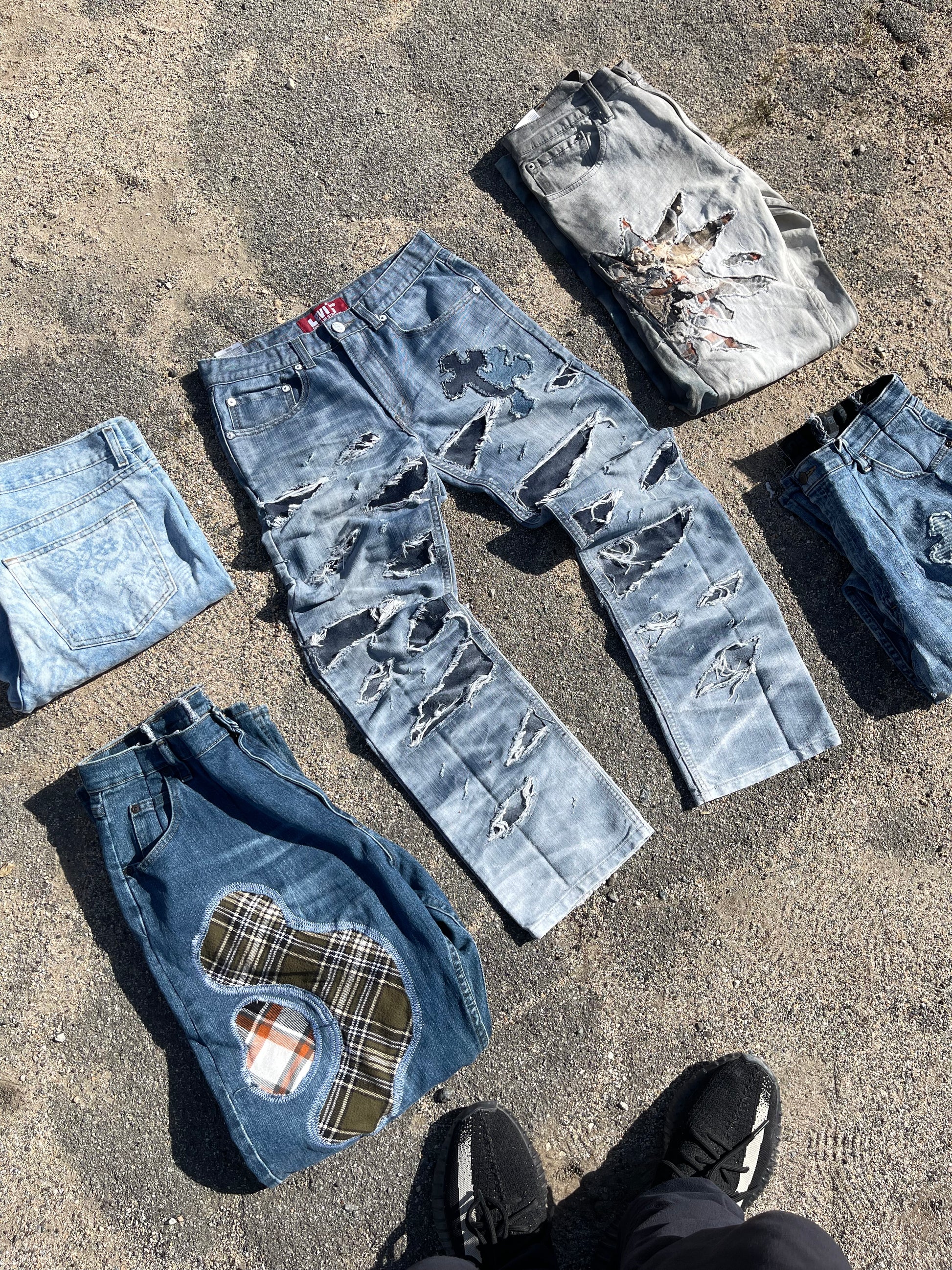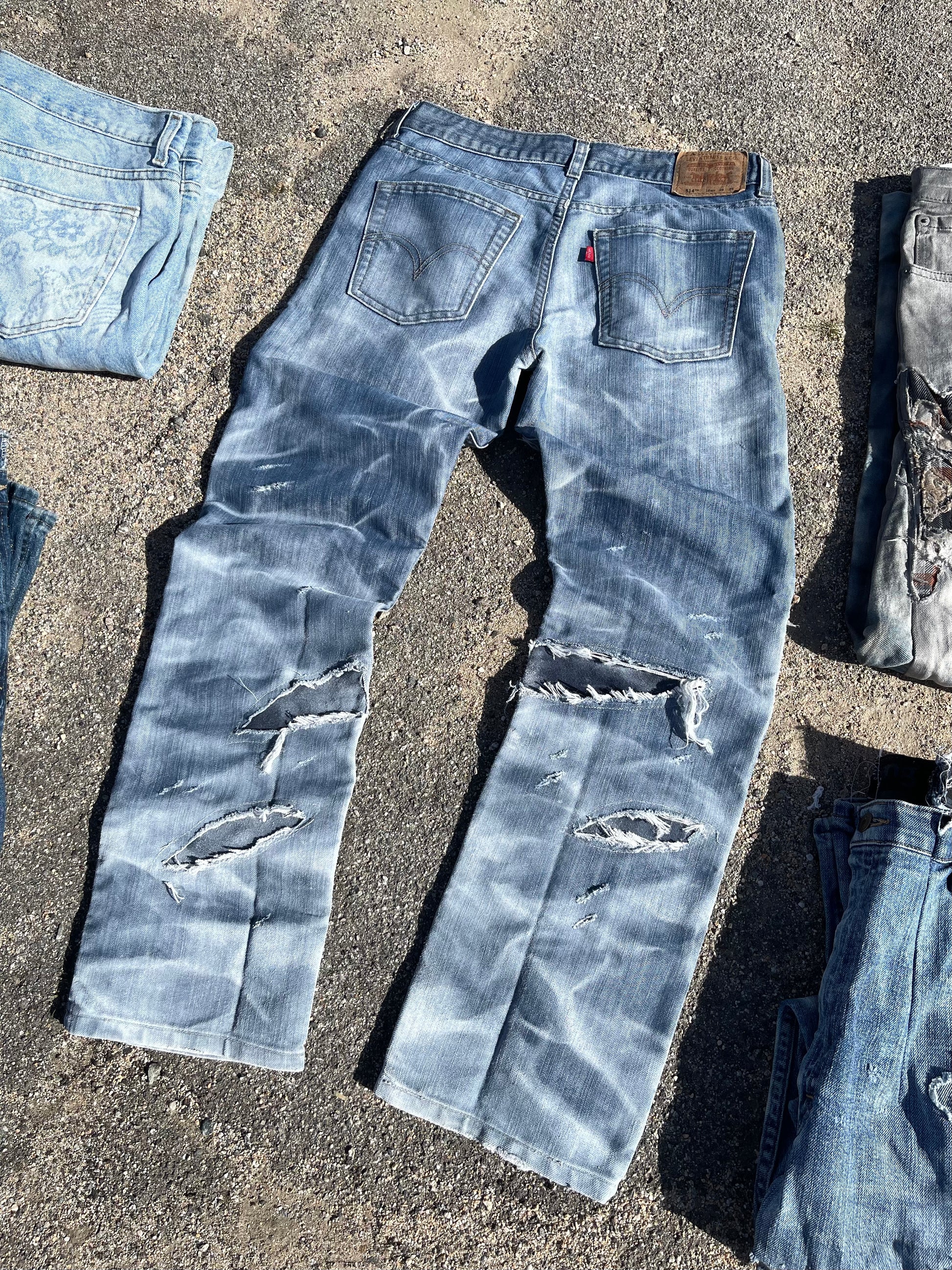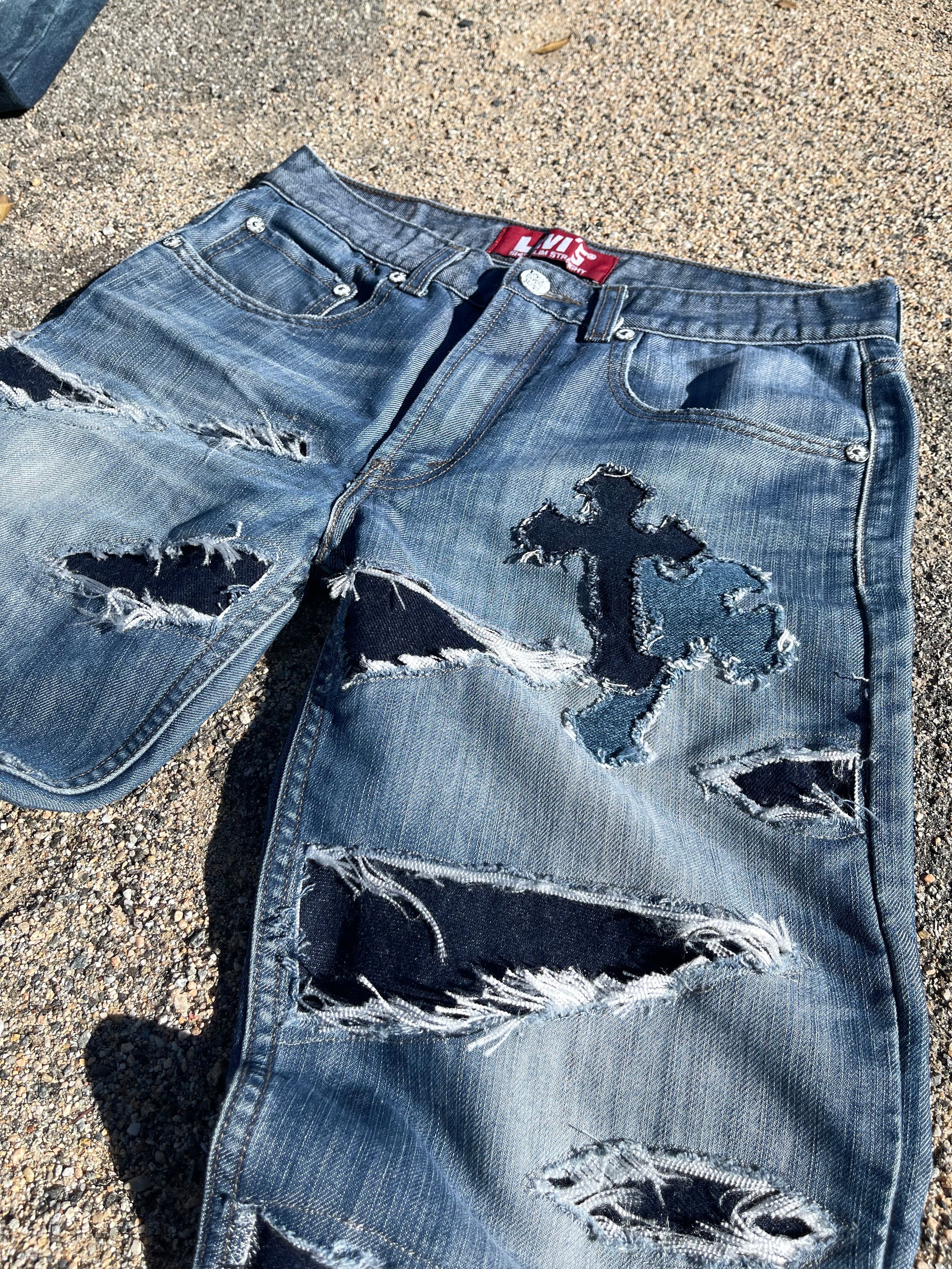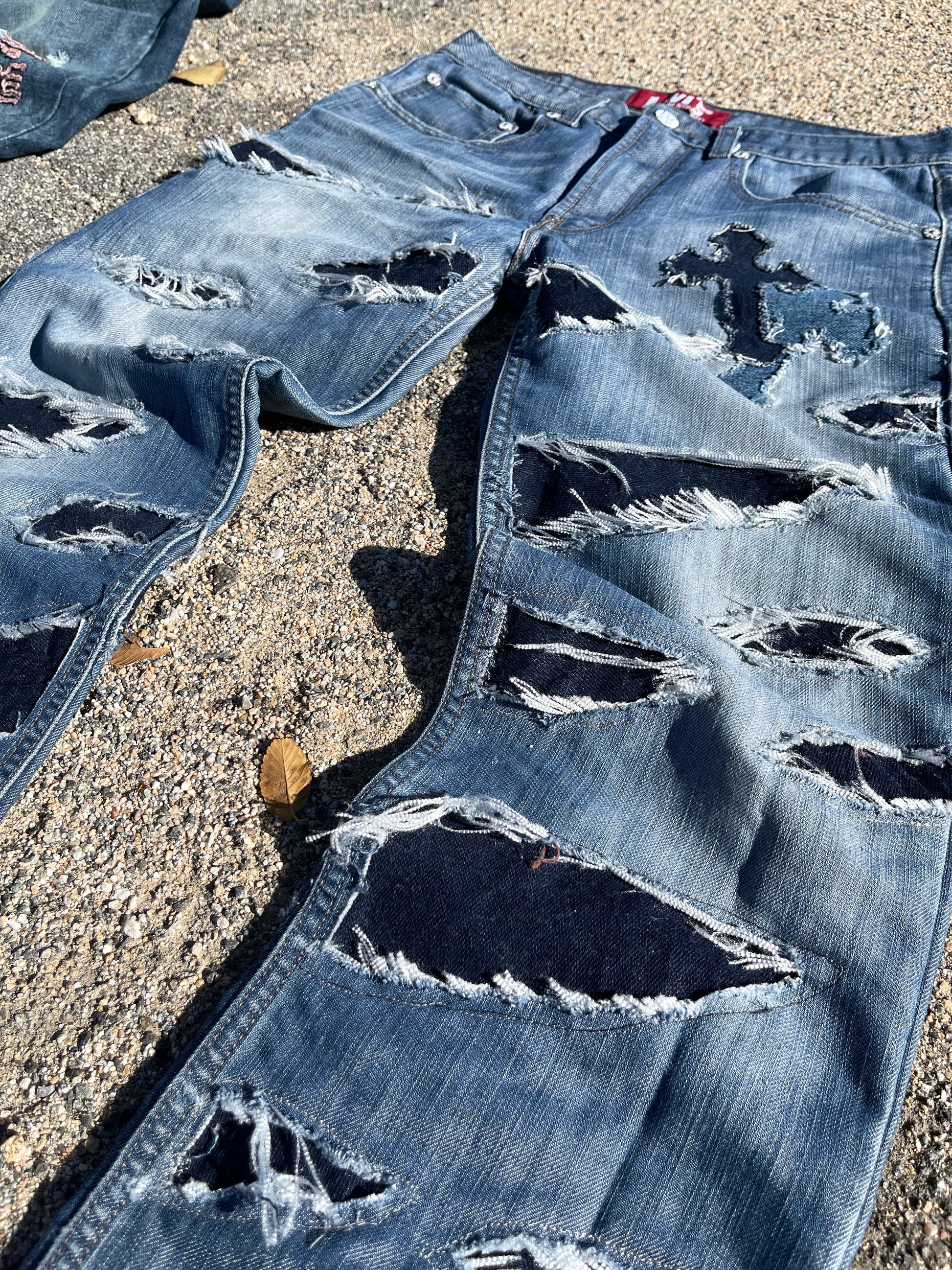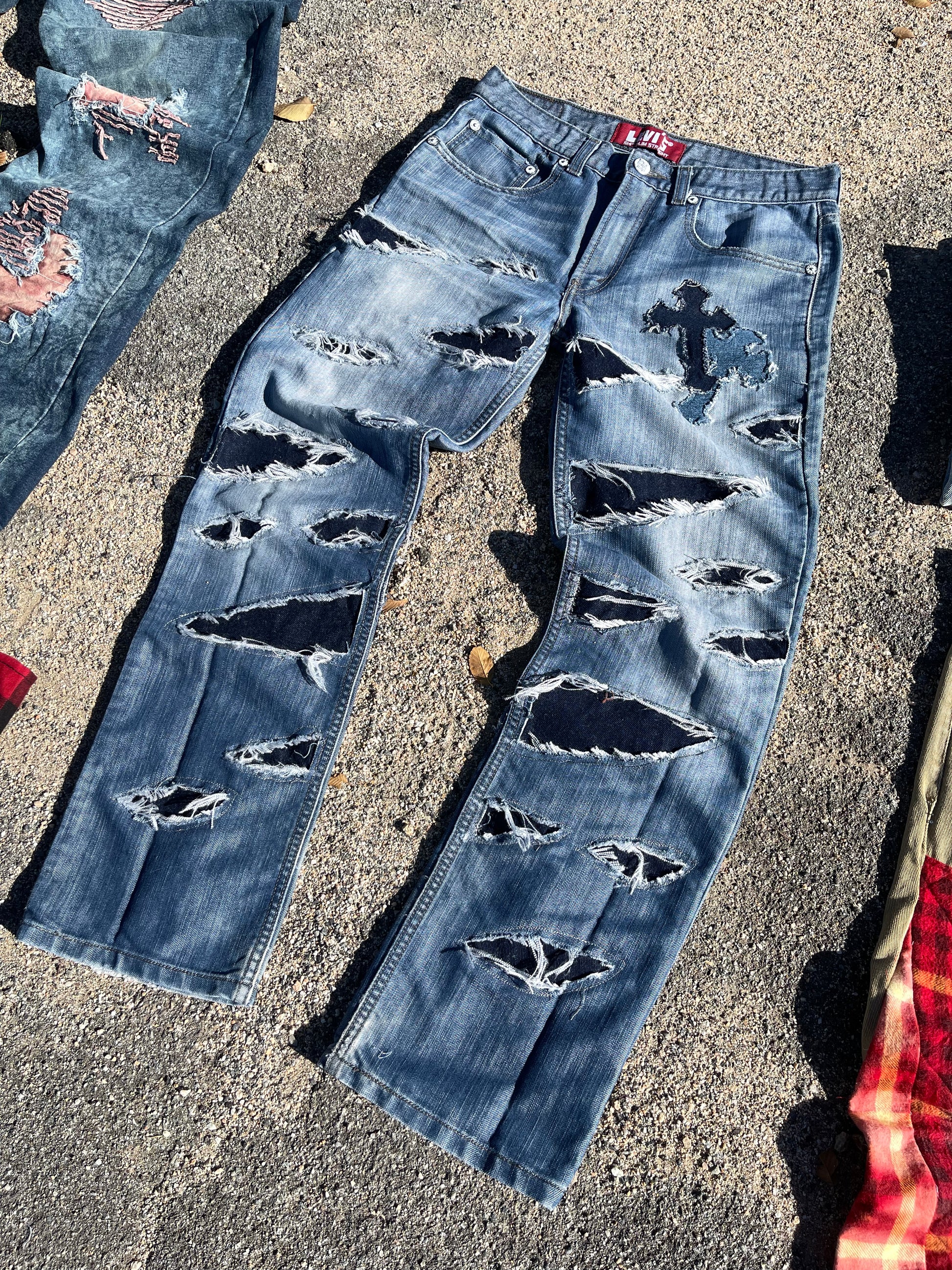 Reworked Levi’s 514. Opened these denims up with some big rips on both legs, stitched some different color denim fabric underneath to get that contrast. And our signs double cross to complete the look. A clean standout piece. 🔥